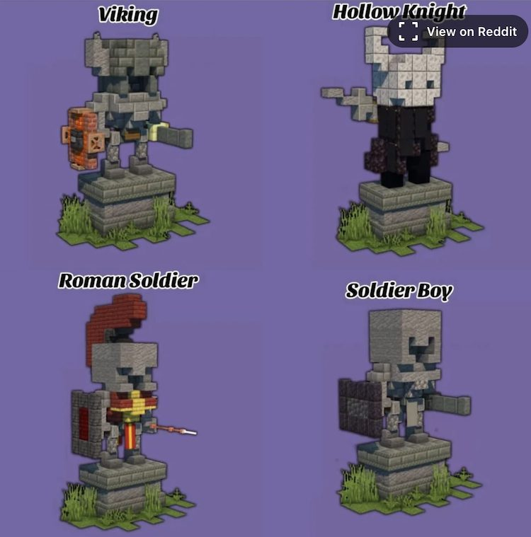 به تازگی کاربر u/Sun_Fal در سابردیت (انجمن) بازی، تصویری را به اشتراک گذاشت که چهار روش مختلف برای ساخت انواع مجسمه را نشان میداد. این تصویر شامل مجسمههایی از یک وایکینگ، «هالو نایت» (Hollow Knight)، یک سرباز رومی و یک سرباز ساده بود. تفاوتها در استفاده از بلوکهای مختلفی مانند پشم، آندزیت و بلوک chiseled stone بود.