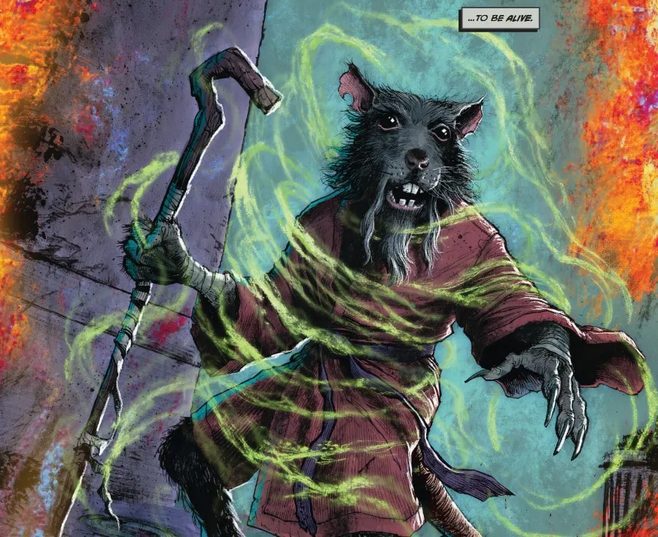 اما حقیقت چیز دیگری است. کمی بعد، در نقطهای دیگر از شهر، همان انرژی سبز جادویی دوباره متمرکز میشود و راوی داستان خود را معرفی میکند: اسپلینتر، که حالا با جسمی کامل به دنیای زندگان بازگشته است. او در حالی که دوباره درد فیزیکی را حس میکند، میگوید: «فراموش کرده بودم زنده بودن چقدر درد دارد.» لاکپشتها هنوز از بازگشت پدرشان بیخبرند، اما شخصیت دیگری به نام «کارای» از این راز آگاه است.