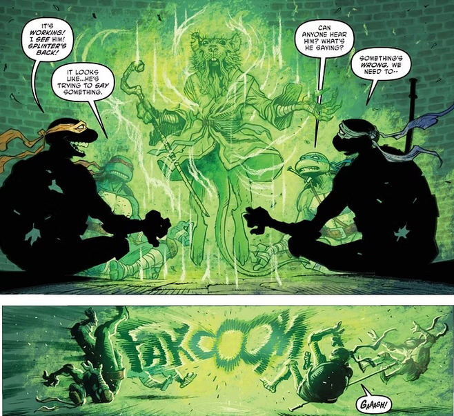 لاکپشتها در موقعیتهای مختلف صدای او را میشنیدند و حضورش را در کنار خود حس میکردند. این دلتنگی تا جایی پیش رفت که داناتلو، در مرز فروپاشی روانی، با یک موش مرده صحبت میکرد، انگار که پدرش در مقابل اوست. با این حال، همین ارتباط خیالی بود که مانع از فروپاشی کامل او شد. حالا در شماره ۱۲، این داستان به اوج خود میرسد؛ جایی که برادران با اجرای یک آیین جادویی تلاش میکنند استاد گمشده خود را بیابند.