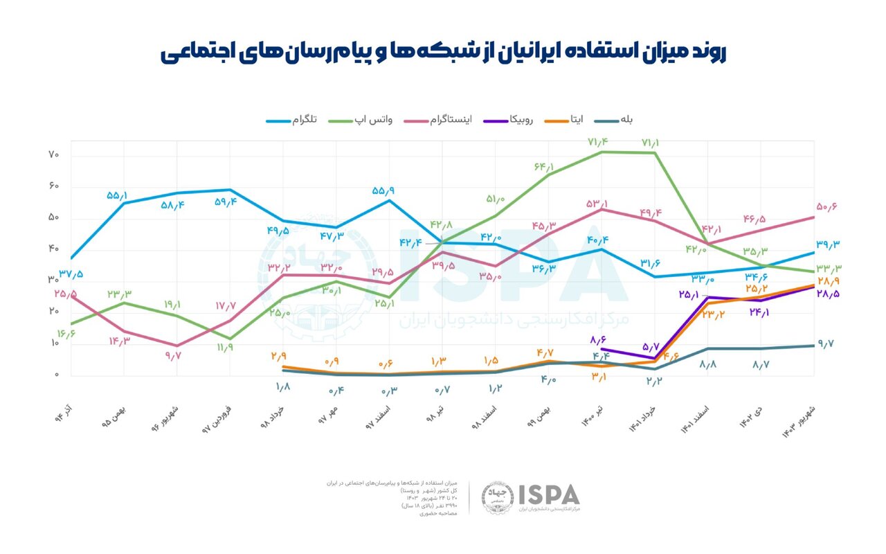 در میان پلتفرمهای ایرانی نیز، ایتا ۲۸/۹ درصد و روبیکا ۲۸/۵ درصد و بله ۹/۷ درصد استفاده دارند. نمودار روند میزان استفاده از پلتفرمهای بومی نشان میدهد، میزان استفاده از ایتا و روبیکا و بله پیش از فیلترینگ (خرداد ۱۴۰۱) کمتر از ۱۰ درصد بوده؛ اما از اسفند ۱۴۰۱ رشد در میزان استفاده از آنها دیده شده است. درحالحاضر، این سه پلتفرم بیشترین میزان استفاده را در سالهای فعالیتشان دارند.