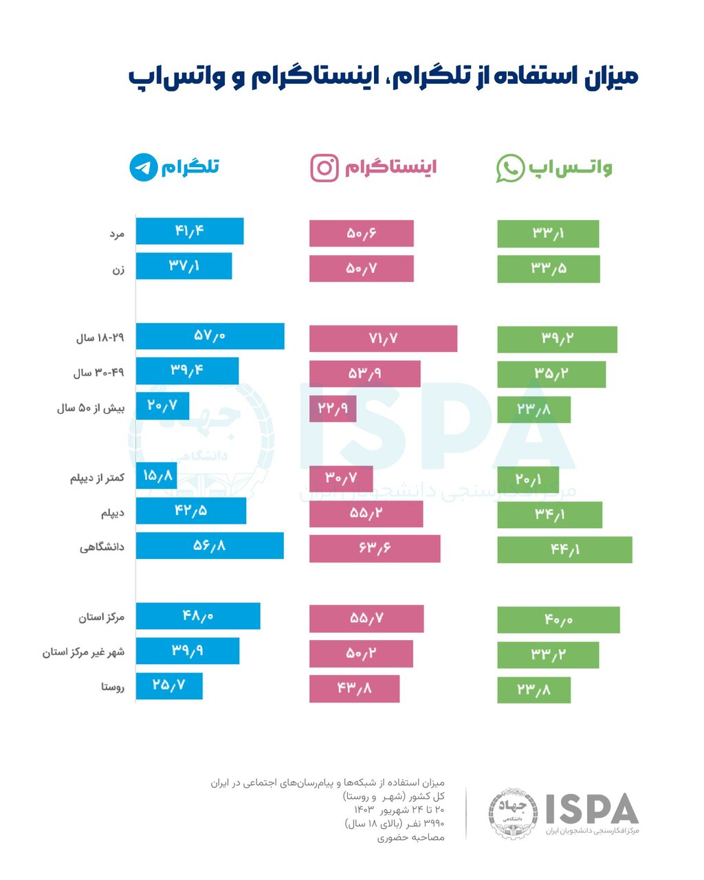 همچنین، این نتایج نشان میدهد کاربران مرد بیشتر از کاربران زن از تلگرام استفاده میکنند. میزان استفاده از اینستاگرام بین زنان و مردان برابر است و درباره واتساپ هم زنان فقط کمی بیشتر از مردان از این پیامرسان استفاده میکنند.