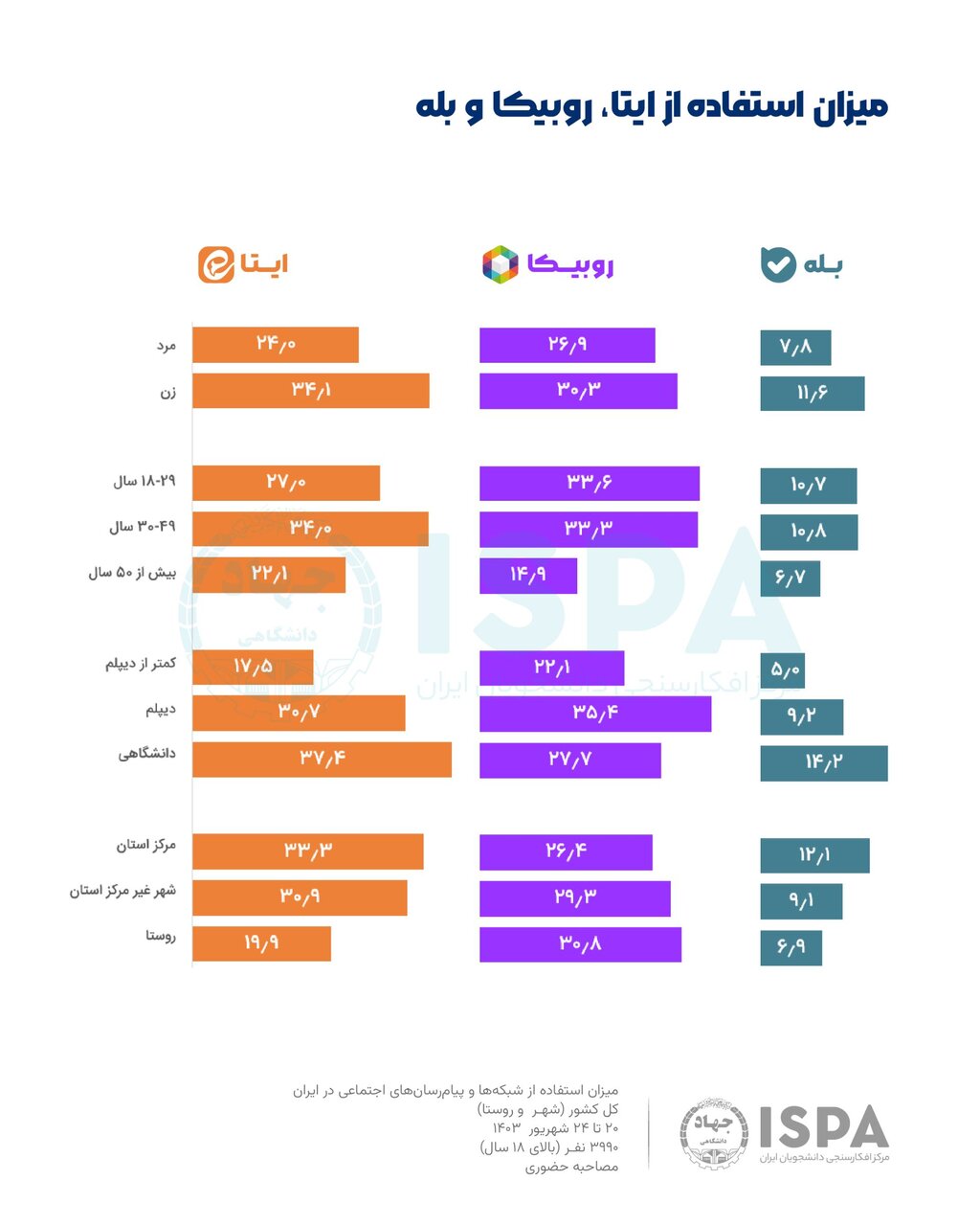 در میان گروههای سنی مختلف، بیشترین میزان استفاده از ایتا برای گروه ۳۰ تا ۴۹ سال و کمترین میزان استفاده برای افراد در گروه سنی بیش از ۵۰ سال است. میزان استفاده جوانان ۱۸ تا ۲۹ ساله از روبیکا بیشتر از ایتا است. دو گروه سنی ۱۸ تا ۲۹ سال و ۳۰ تا ۴۹ سال استفاده تقریباً مشابهی از دو پلتفرم روبیکا و بله میکنند.