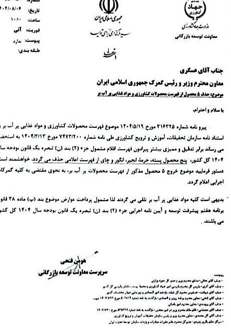 در این نامه که به‌منظور اجرای بند (ب) ماده 38 قانون برنامه هفتم پیشرفت و توسعه و آیین‌نامه اجرایی جزء (2) بند (ن) تبصره یک قانون بودجه سال 1404 صادر شده، تأکید شده است که سایر محصولات و مواد غذایی پرآب‌بر همچنان مشمول پرداخت عوارض مربوطه خواهند بود.