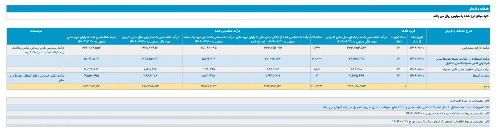 درآمد حاصل از اتصال متقابل سایر اپراتورها حدود ۵۱۷ میلیارد تومان گزارش شد. همچنین، فروش خطوط جدید تلفن همراه درآمدی معادل ۲۳ میلیارد تومان ایجاد کرد. خدمات دیگر مانند آوای انتظار، دفاتر و هواداری نیز ۵۵ میلیارد تومان درآمد داشتند.
